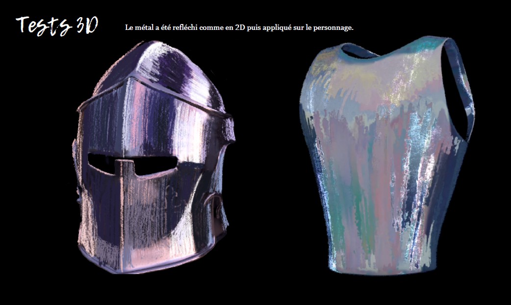 First of all, we had to think about how to represent light-reflecting materials such as glass and metal using our graphic style. Metal is the main component of our characters, so this was the first textural research we did in 3D.