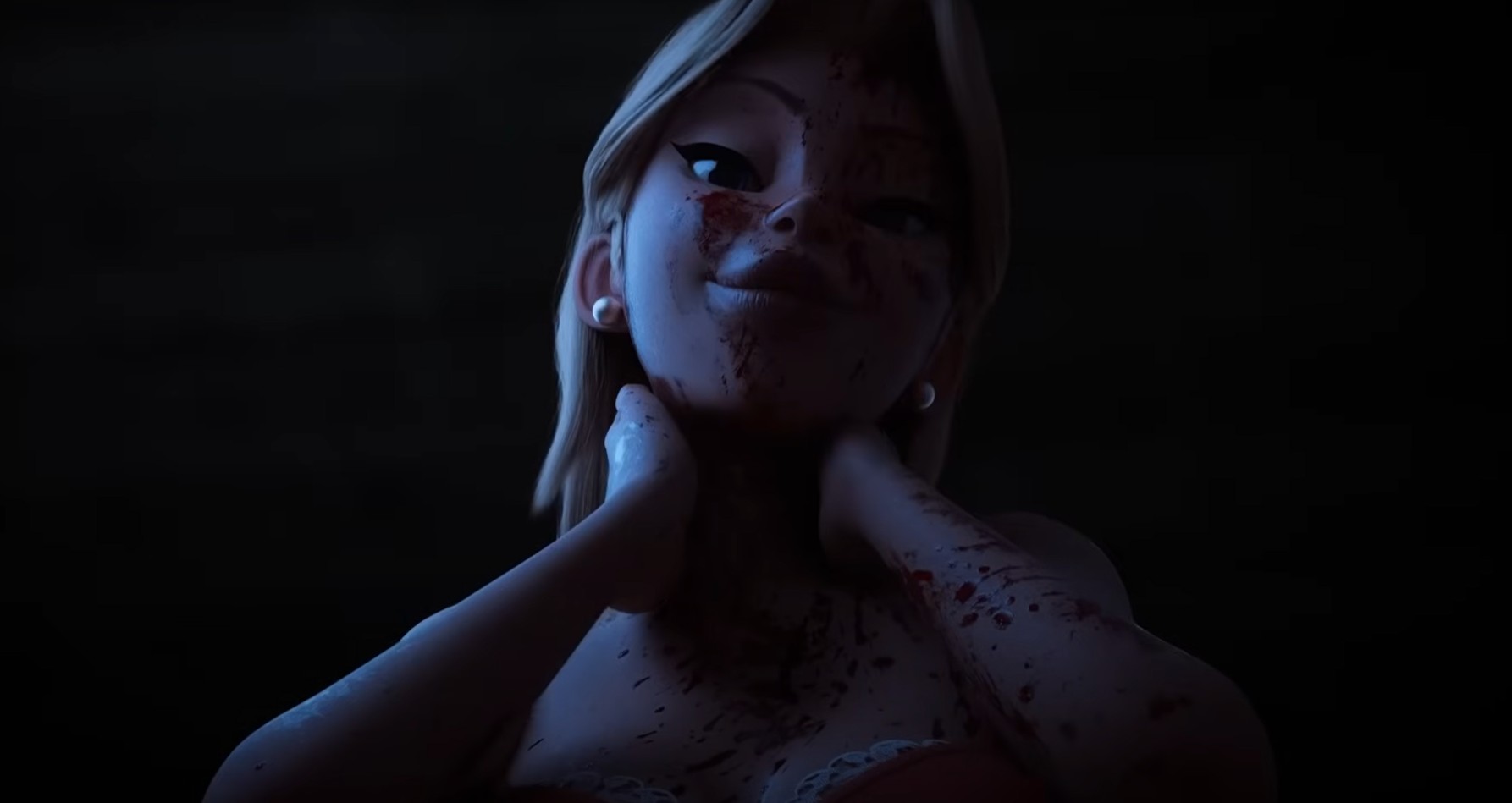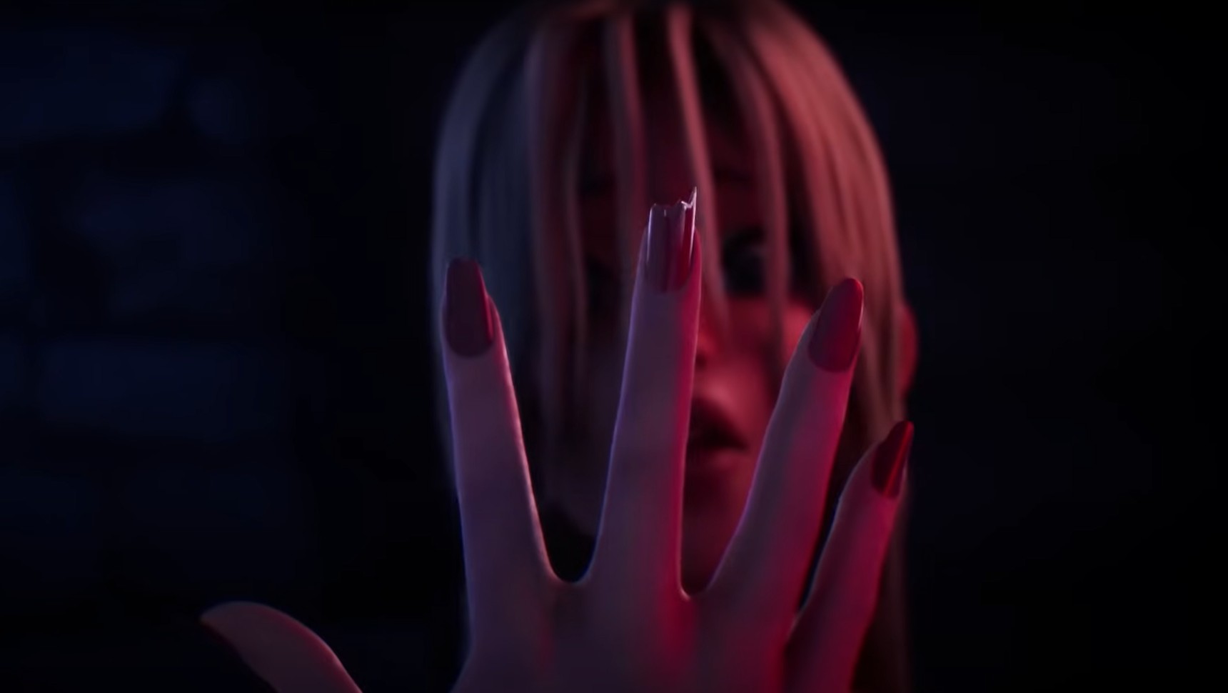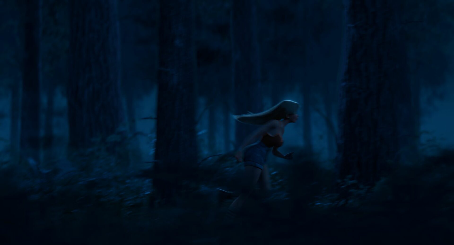 The story is based on a scene from a horror film, in which a young blonde woman, Ashley , runs at full speed through a forest in the middle of the night to escape a killer.
