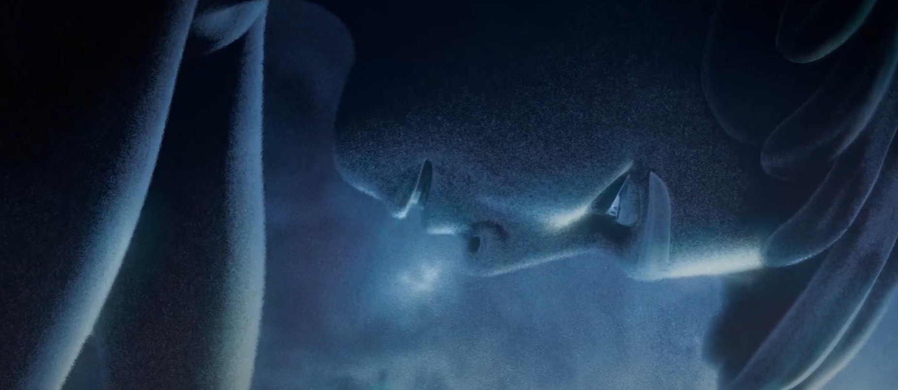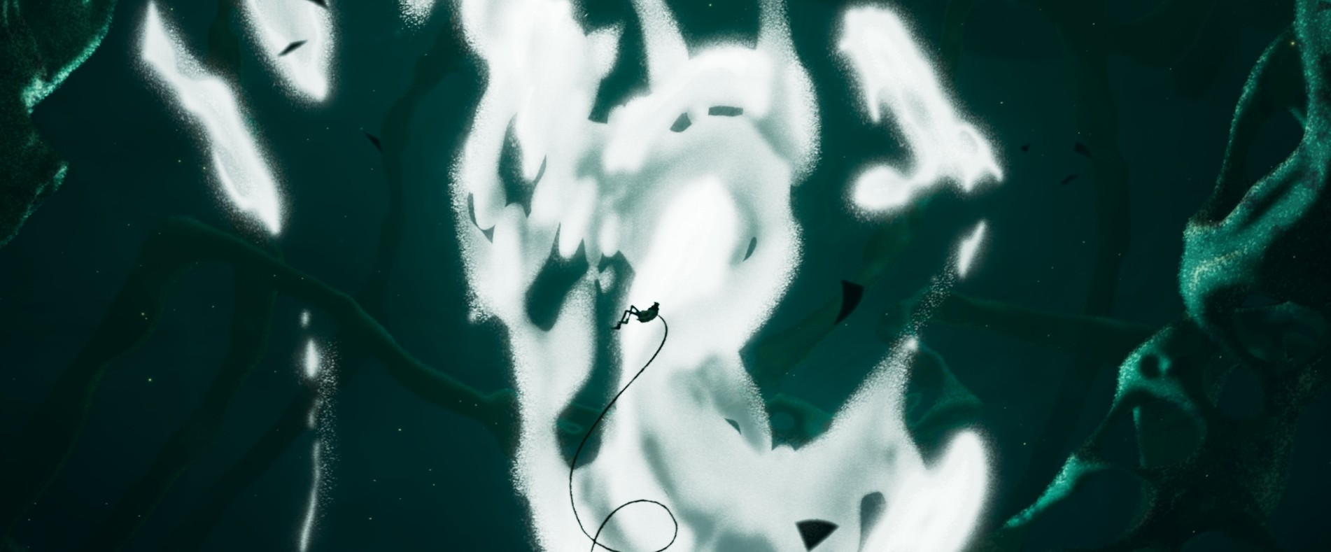 Une silhouette féminine blanche flotte vers lui, il se lève et la suit. Il décide de lâcher le reste du câble encore attaché puis regarde la silhouette blanche plonger dans l’eau.