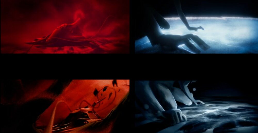 Il décide de la suivre dans les profondeurs. Il nage vers elle et lui tend sa main.