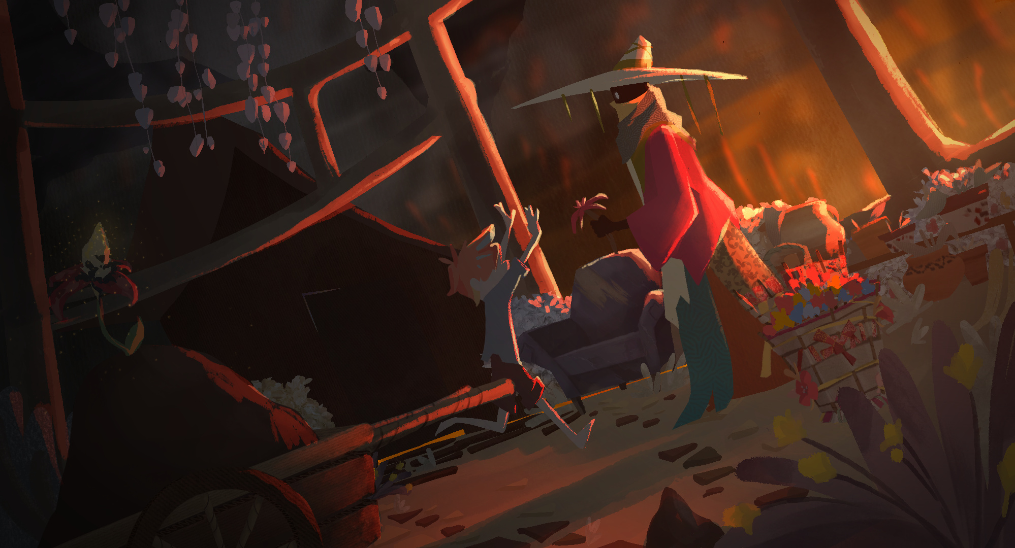 Milo détruit la serre. Il lance les pots, renverse la charrette et écrase la fleur brillante.