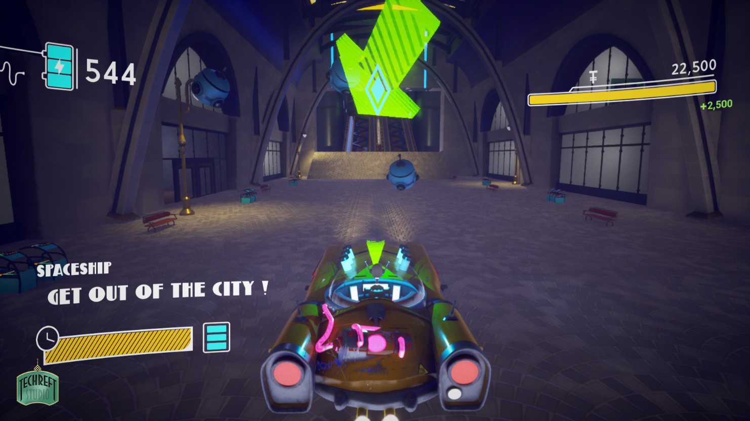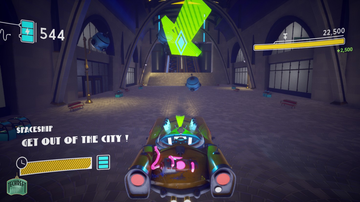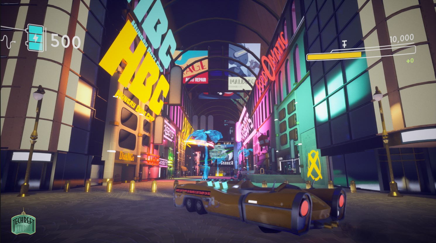 À bord d’un taxi historique de la multinationale Rubber, vous sillonnez les rues futuristes de Mediphira, une ville délirante peuplée de robots hauts en couleur.