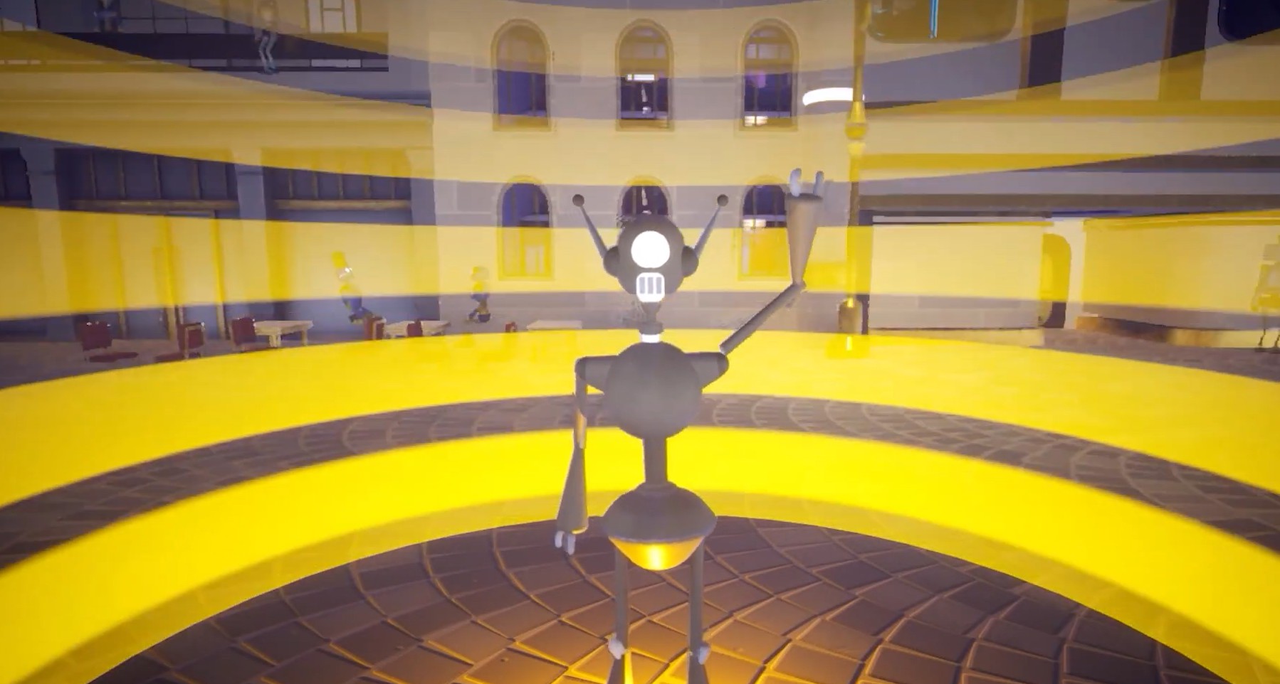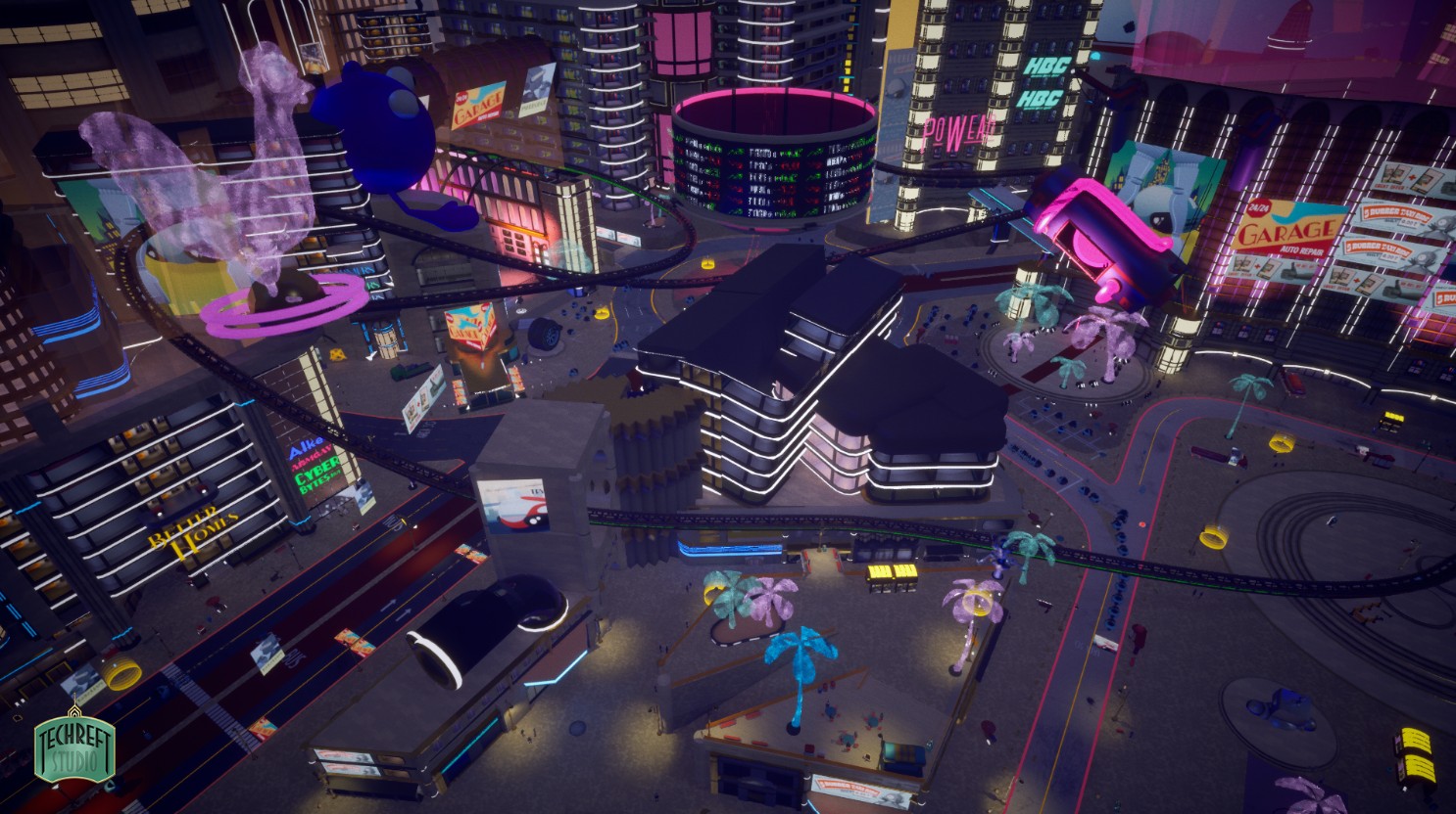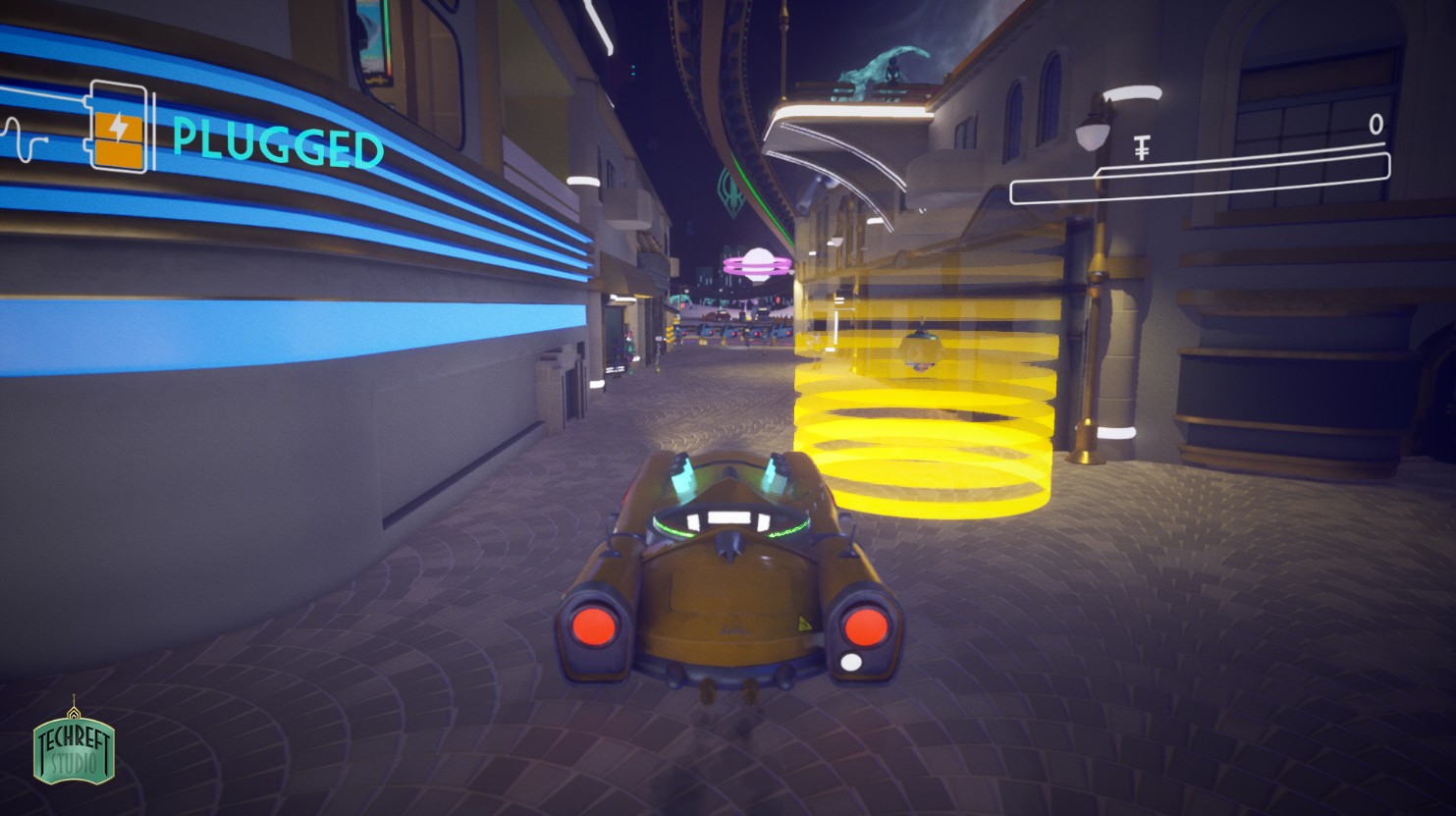À bord d’un taxi historique de la multinationale Rubber, vous sillonnez les rues futuristes de Mediphira, une ville délirante peuplée de robots hauts en couleur.